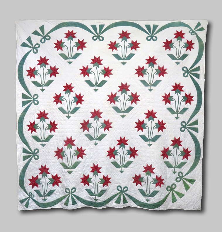 Festoon your home this holiday season with the perfect antique hand appliqued quilt for art on your wall, bed or decorating in general. In gorgeous solid Turkey red and overdyed green you just can’t get any more festive. 16 hand appliqued lilies dance among flower buds on a pristine white ground. Solid Turkey red jabots and bows circle the white border measuring 12 3/4 inches on the side borders and 10 inches top and bottom (quilt shown horizontally in photo). Finely done hand quilting consists of outline on each appliqué, 6, 7 and 8 petaled floral motifs in differing sizes and leaf filled trailing vines in the white background. The quilt has a white backing and is finished with a ¼ inch hand applied white binding.