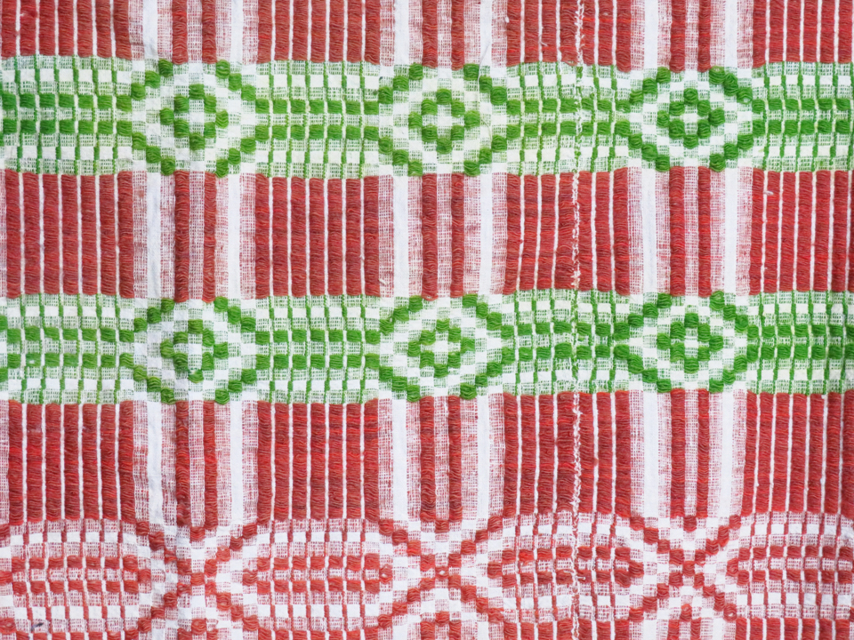 Unused condition. This linen and wool coverlet was created using a 33 inch loom. It’s a perfect size for a couch or throw. Very unusual and exquisite piece consisting of rust, ecru and Kelly green. One area of discoloration.
