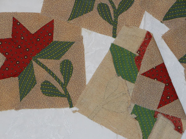 Beautiful and early these blocks are hand pieced and appliqued in gorgeous madder dye and over dyed green calicoes. They would make a fabulous wall hanging or small quilt. One block has two imperfections ¼ inch in from one edge - see detail image - and there is slight fading in some of the brown calico which does not detract from the overall desirability and beauty of the blocks. We do have additional blocks available that have seam pops or other imperfections if you're interested in making a larger piece.