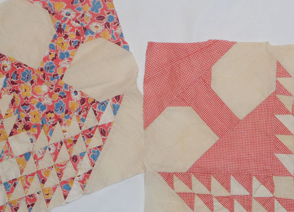 Tree of Life quilt blocks are always a favorite find. The small red and white check quilt block has been treadle sewing machine pieced, the floral quilt block is pieced by hand. Small triangles measure approximately 1¼" per short side. These were sewn together at some point in their long life with a ¼" seam allowance – the faint sewing lines are still visible. Otherwise the blocks appear unused.