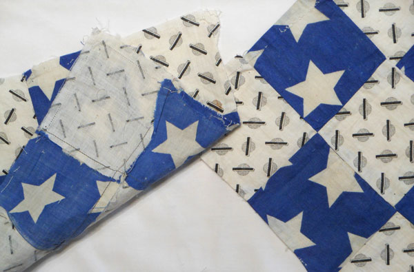 What wonderful prints used in these fun and graphic treadle machine pieced blocks. Large scale white stars on medium blue is paired with a black on white cotton print we, at first glance, thought was Saturn...take a look at the detail image. These great blocks were sewn together and made into a tied quilt at some point in their life and the treadle machine stitching lines are still visible approximately ¼” from the edge. There are some errant threads left behind as seen in the images which we have since removed! Lovely, clean condition.