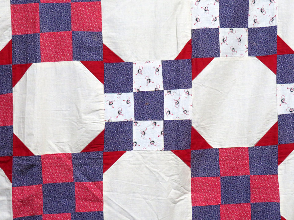 9 patch quilt top with alternating large pieced snow ball blocks. The early double purple fabric has little hearts creating an early conversation print. Another block has a conversation horseshoe print. Pieced by using an early sewing machine, the snow ball blocks have an 8 3/4 x 8 3/4 area calling for beautiful quilting.