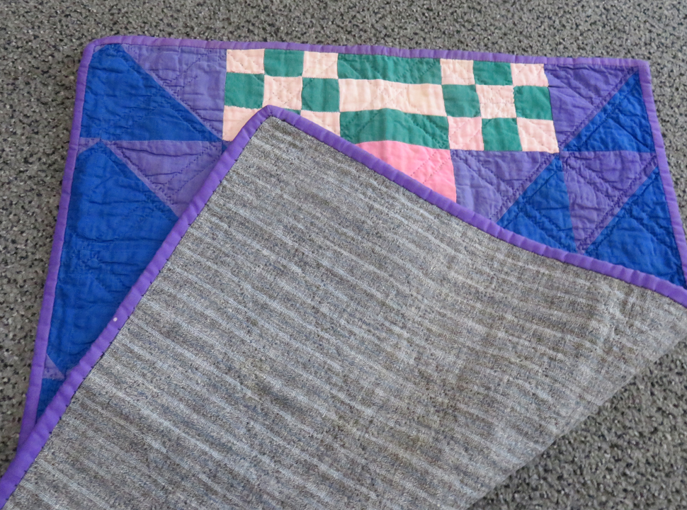 This quilt is almost perfect. There are a few flaws which show up only under close examination. There is a miniature 9 patch block and half of another one, and the sides are half of a diamond in a square. Created from the clothing fabrics of Amish children, with a few dark colors probably from adult clothing. Machine pieced, hand quilted, great graphics and colors. This is exactly how I found it, but I suspect it may have been made from an adult quilt. Professionally hand washed by Betsey.