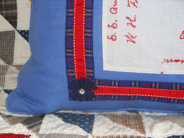 A few years ago Country Home Magazine did a wonderful story on Betsey, her antique quilts for sale, and her restoration business. Their designers fell in love with the Redwork Signature blocks we had in the shop and made a few fabulous pillows for us using some of their favorites. The Redwork blocks are circa 1885 and are paired with contemporary linen, ribbons and/or buttons. They each have a down feather insert and invisible zippers. Gorgeous and very comfy they are priced individually. This pillow has a patriotic color palette with hand made ribbon flower buttons with jewel centers - please see the detail pictures. A lovely mix of antique and contemporary - each pillow is unique.