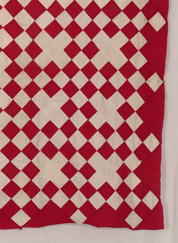 This little bassinette quilt top is a small graphic treasure in its classic palette of solid red and white. Postage stamps ranging in size from 1 1/8 inches to 1 1/2 inches per side form the checkerboard pattern in this quilt top. There are also interesting longer pieces measuring approximately 3 1/2 inches long, forming crosses here and there. Solid red triangles form the edge of this miniature quilt top attesting to its original intent to be a bassinette quilt. With your backing, filler and a binding it will make your child's crib complete. It would also be a fabulous bit of graphic art hung on the wall. This quilt top was made by hand and put away to be finished into a miniature quilt later – by you, don’t you think? It is in excellent, unused condition.