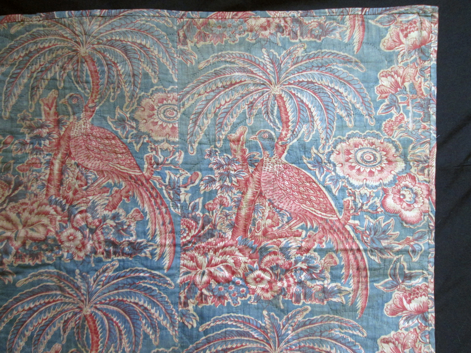 Bird of Paradise Palm Tree fragment. We know it dates from c. 1815 because this fabric is featured in the Victorian Albert Museum book. The binding fabric comes from the original quilt. It is in almost perfect condition. This is a very rare and special piece.