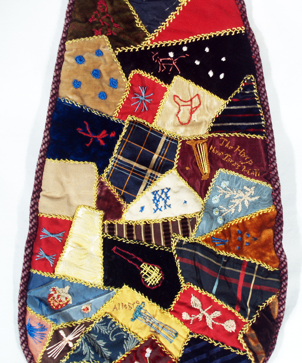 One can see by the shape of this Victorian crazy quilt fragment that it is that of a violin. An Amish woman created this as a present for a violinist to put inside his violin carrying case to carefully protect the violin from any damage. The imprint of the violin can be seen in the silk velvet backing. Obviously a present for some special person, a piece such as this would never have been an embellishment in an Amish home.