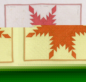 We chose a red and white striped fabric of the same date for the 1/4 inch applied binding which sets off each star beautifully. The backing is the same white as used on the front. These pieces are wonderful either alone (they are $175 each) or displayed as a grouping as we have shown them. Professionally hand washed by Betsey.