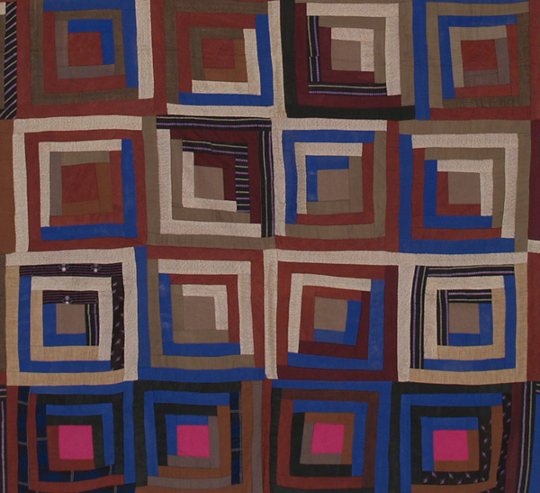 Q6468 Log Cabin Courthouse Steps Quiltc.185072 x 80 (182.9 x 203.2 cm) Found in PA, made in New England Was $2,200 Now $1,800 A wonderful piece of abstract art in excellent condition, this log cabin quilt arranged in the Courthouse Steps pattern has a personality all its own. Made from wool and silk challis, this hand made antique quilt’s striking colors make it unusual, its surprising bits of plaid, striped and floral fabric just add to its uniqueness. Each 11 x 11 ½ inch block is made up of 1 – 1 ¼ inch width logs with varying hues used for the chimneys – including fuschia! Foundation pieced and hand quilted along each seam. The ½ inch binding on two sides is an applied burgundy wool challis, and the wholecloth c.1860 cotton backing is a brown, burgundy and ecru small scale squares and dots pattern which folds over to the front on opposite sides to form the other two bindings. There are a few “original” moth holes - ask Betsey for more details on this one. |