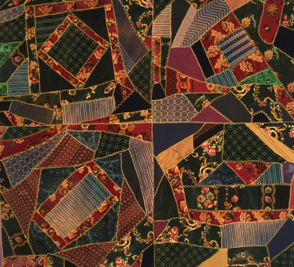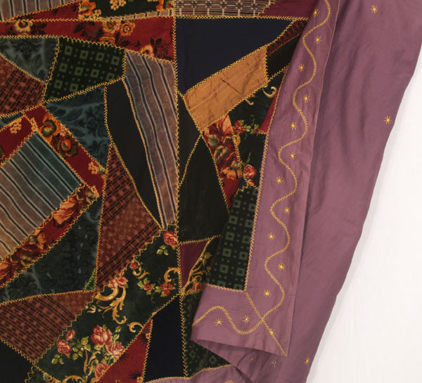 A sumptuous velvet quilt in lavender, deep greens, and blues. Such a wonderful palette in soft to the touch, cozy upholstery fabric. The floral, solid, and striped cotton velvet upholstery pieces have been seam embellished with traditional feather and herringbone stitches, with other various and original stitch designs using gold pearl cotton.
