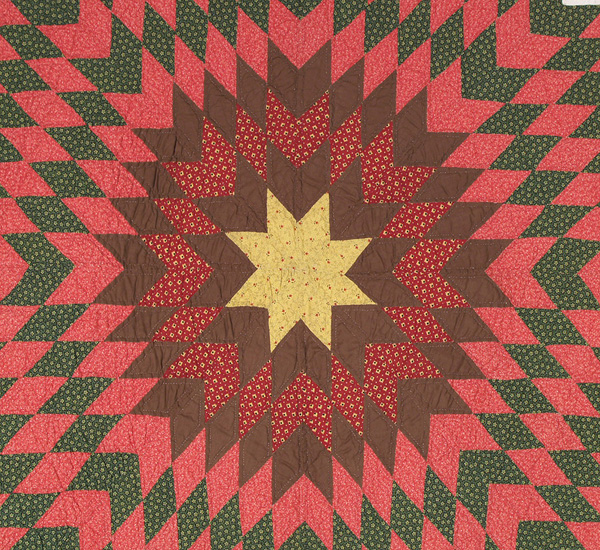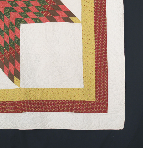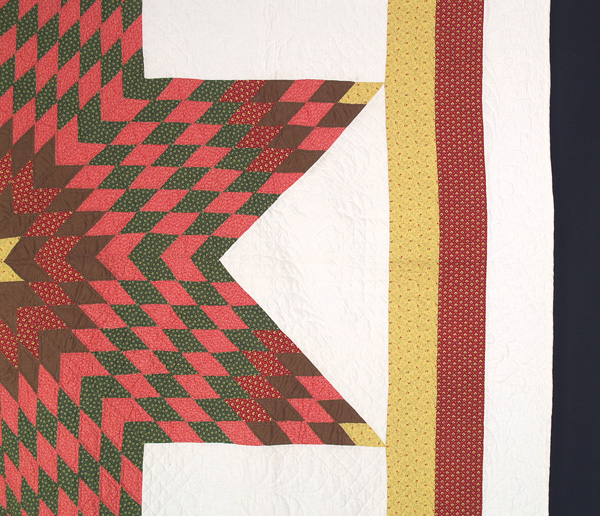 What a perfectly exquisite piece of art for your wall! The huge star dominates the quilt, radiating outward with 2 inch diamonds of yellow calico, solid brown, madder geometric print, double pink, and overdyed green. A triple border of matching yellow calico, madder, and white contain the star, and the white background matches the backing and 3/8 inch separately applied binding. This beautiful quilt has been densely quilted with medallions, outline, cross-hatching, and meandering feathers by a very skillful needlewoman with a confident eye for graphics. A fabulous find in that desirable Pennsylvania combination of yellow and browns. Professionally hand washed by Betsey.