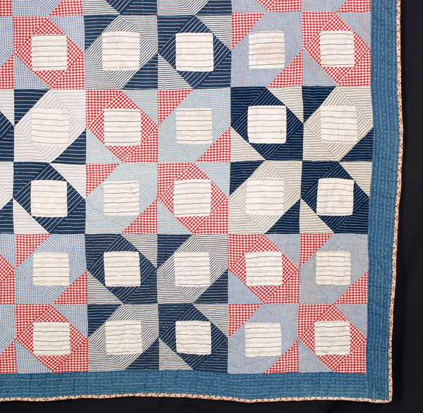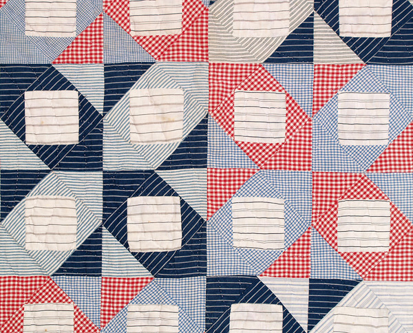 What a fantastic red, white, and blue quilt for a boy’s room or great room! Cotton shirtings, chambray, stripes, and checks have been pieced in a combination of Broken Dishes and Diamond in a Square patterns. The blocks are approximately 4 ½ inches square, and the entire quilt has been hand quilted in a gentle arcs. The separately applied 3/8 inch binding is a black and white print on pink, and the backing is a medium solid blue chambray cotton. In excellent condition and professionally hand washed by Betsey.
