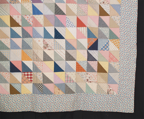 A sweet and cozy quilt in excellent condition comprised of wonderful 1920’s to c.1930 fabrics. Each triangle has two 4” sides and is hand pieced. A 6 ¾” wide calico border in blue, red, green and white make a lovely frame for a lively center design filled with movement.