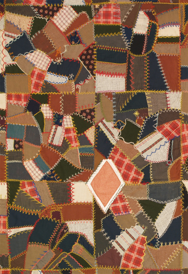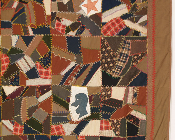 A 4 ½" double border in two shades of tan wool challis frames the inner design and has intricate embellishment along the entire border seam on four sides. The backing is a brown, red and yellow small scale plaid cotton with a 5/8" applied brown wool challis binding. In excellent condition this quilt is a rare find. Our quilts are always sent on approval.