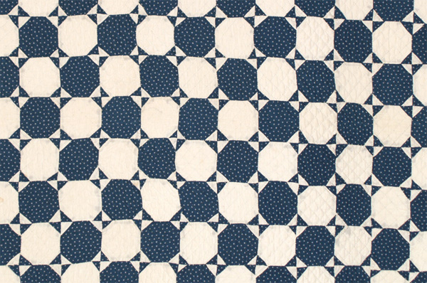 Such an eye pleasing indigo and white quilt created using a combination of the Broken Dishes and Snowball patterns. Blocks measuring approximately 2 ¾” wide contain one octagon piece and four corner triangles measuring a mere ¾”. A mesmerizing effect is achieved through the positive/negative arrangement of octagons (snowballs) and triangles (broken dishes) in this great piece of art.