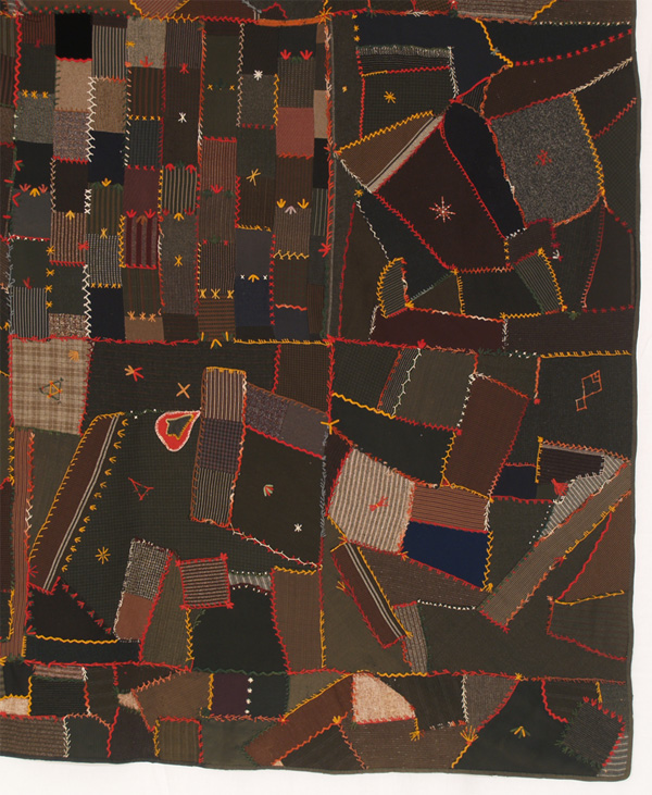 A fabulous wool folk art crazy quilt with a myriad of interesting and unique symbols and embellishments straight out of this quilter's imagination. Various solid and patterned worsted wools, challis and wool suiting fabrics combine in a muted palette of olives, browns, wine, black and ecru to form the subtle background. The artist used this as a canvas onto which she embroidered both whimsical and traditional designs using solid and variegated wool yarns in bright, warm hues. Appliques of crocheted wool and bright wool challis in amorphous shapes and geometrics add even more charm.