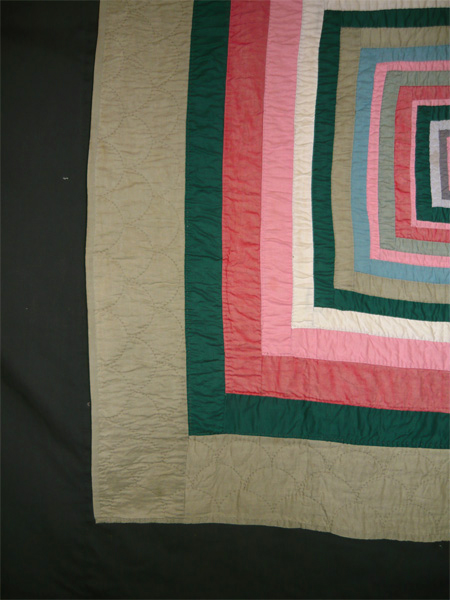 This sophisticated and graphic crib quilt is made entirely of cotton in wonderful solid shades of red, rose, deep green, blue, greenish gray, eggplant and off white, and backed with a solid medium gray cotton. Concentric squares in varying widths ranging from a mere 3/16" up to 4 1/2" surround a central two color bars pattern in blue and greenish gray. Bars measure 1/2" x 2 3/8". The gray backing folds to the front forming the 3/8" hand stitched binding. Hand quilting in brown thread includes outline stitching for the concentric squares with clam shell stitching in the outer gray border.