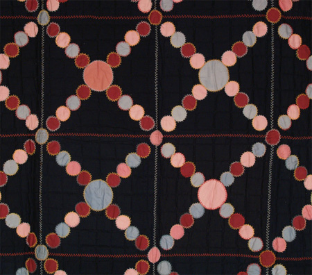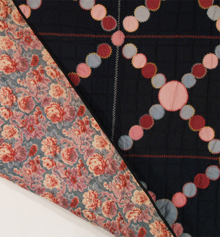 What a whimsical and very graphic Folk Art quilt! Appliqued circles in burgundy, rose and light blue cotton are carefully hand sewn onto a dark navy cotton twill ground. Herringbone embellishment stitching surrounds each circle and seam on the 16 x 16 ½" inch blocks. The circles form a large X pattern overall. A 3 ½" inch border in the same solid navy cotton surrounds the interior pattern.