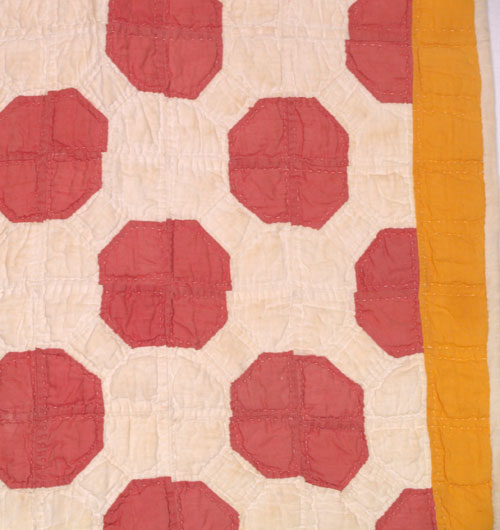 A sweet, early bassinet quilt hand pieced and quilted in the Bow Tie pattern. The maker's choice of palette in solid Turkey red, cheddar and off white make it graphic, while her imprecise cutting and hand piecing make it charmingly naïve. Add to that evidence of somewhat irregular hand quilting stitches and it suggests creation by a young girl, possibly for a new sibling? Whatever its history it makes for a great piece of folk art for either a traditional or contemporary setting. The placement of color makes a snowball or bull's eye pattern with the off white bow ties becoming the background.
