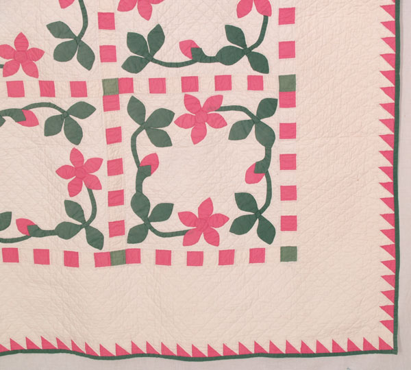Precise applique stitches are tiny and even as is the skillful and meticulous hand quilting. Quilting stitches are executed in a ¾ inch diagonal cross hatch in the white ground and border with outline used in the sashing and sawtooth border. There are a few, very faint pencil lines used for marking the quilting pattern in places. The backing is white and the applied ⅜ inch binding is in the same solid green cotton used for the leaves and stems.