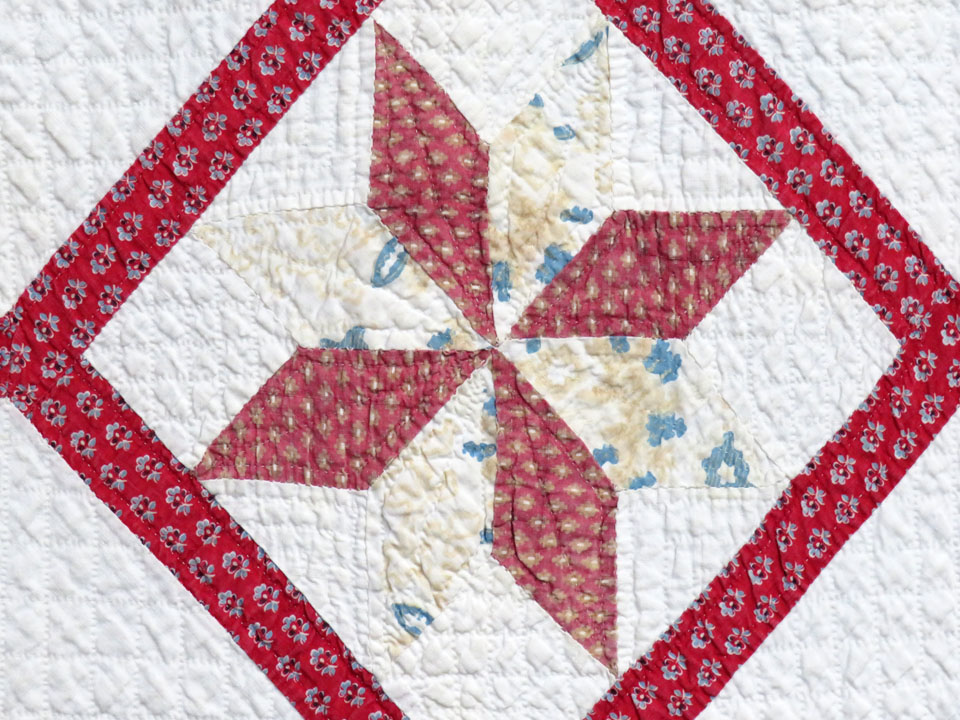 All of the sewing is by hand due to the fact that the quilt was made apx 20 to 30 years prior to the sewing machine being available for public use. The diamonds in the Lamoyne stars are 2-1/4 inches with 2 inch sides. It has a 2-1/4 in border, 1/4 inch applied binding and the border triangles measure apx 3x2x2. The garden maze strips are 7/8 in wide. Unbelievable quilting with tiny tiny stitches. Strips, stars and triangles are all outline quilted. The white areas have cross hatch quilting in 1/2 inch grids. The Lamoyne stars have an early 19th century madder root dyed calico and early 19th century block print. Professionally hand washed by Betsey. This quilt appears to be in barely used condition.
