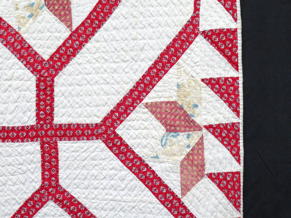 This stunning early garden maze quilt comes from Massachusetts. The story that the fabric is telling us is that it was created by a very affluent family. The turkey red calico fabric dates back to apx 1780-1815 and was one of the most expensive fabrics to purchase. The garden maze pattern is one of the earliest known patterns. Because of the size of this quilt, it can be used on a queen or king size bed. If you choose to hang this amazing textile as an incredible piece of art, it may be hung in either direction because there’s no specific top or bottom. Not only is this quilt stupendous for the holidays, but it would be an amazing focal point on a wall or bed throughout the year.