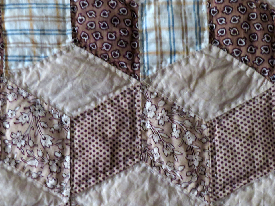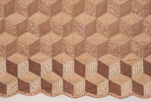 A wonderful Civil War era bassinet quilt in perfect condition. The diamonds that form the tumbling blocks measure 1 3/4 inches per side. The color palette is warm and consists of two brown, tan and ecru calicoes, a sweet brown on tan polka dot, a blue, white and brown cotton plaid, and a solid tan cotton. The fabric patterns were carefully arranged by the maker to form a center medallion - a very nice touch that adds even more graphic appeal to the wonderful Tumbling Blocks pattern. Completely hand pieced using very tiny stitches, and outline hand quilted throughout.