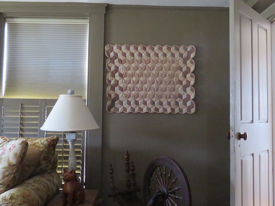 The backing of the quilt is a great rust and brown on tan small scale floral cotton which is also used for the applied 3/8 inch all hand binding that follows the shape of the tumbling blocks. This perfect little quilt appears unused and has been professionally hand washed by Betsey. It can be sent to you on approval for private review.