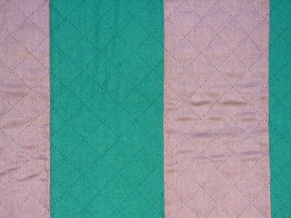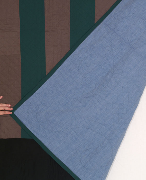 This extraordinary mint condition Amish Bars Quilt was created by the Esh family. Once again I see an Amish quilt that has been pieced by machine and then exquisitely quilted. Piecing by machine would definitely make a quilt stronger. This quilt has a 7/8 inch applied binding. The black outer border is 12 inches wide. The corner squares are 12 x 12 inches and have a wreath designed in the shape of a horseshoe. The bars are 5 inches wide and approximately 46 inches long. The backing is a blue chambray fabric which shows off the perfectly executed quilting done using black thread. All fabrics on the front of this quilt are a fine wool challis. I believe this quilt was made for a man because of the wide black borders, the black fabric being men’s clothing. This quilt is in mint condition, meaning it has never been used or washed.