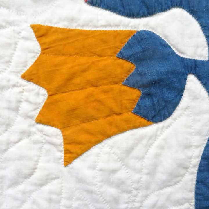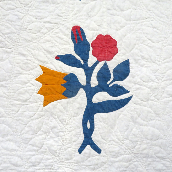 The needlework on this quilt is exquisite. The maker used tiny, perfect stitches for both the applique work and hand quilting. The applique tulips and roses in solid cheddar and Turkey red, respectively, have solid blue vegetable dyed stems and leaves. The Turkey red buds between the flowers are reverse appliqued.