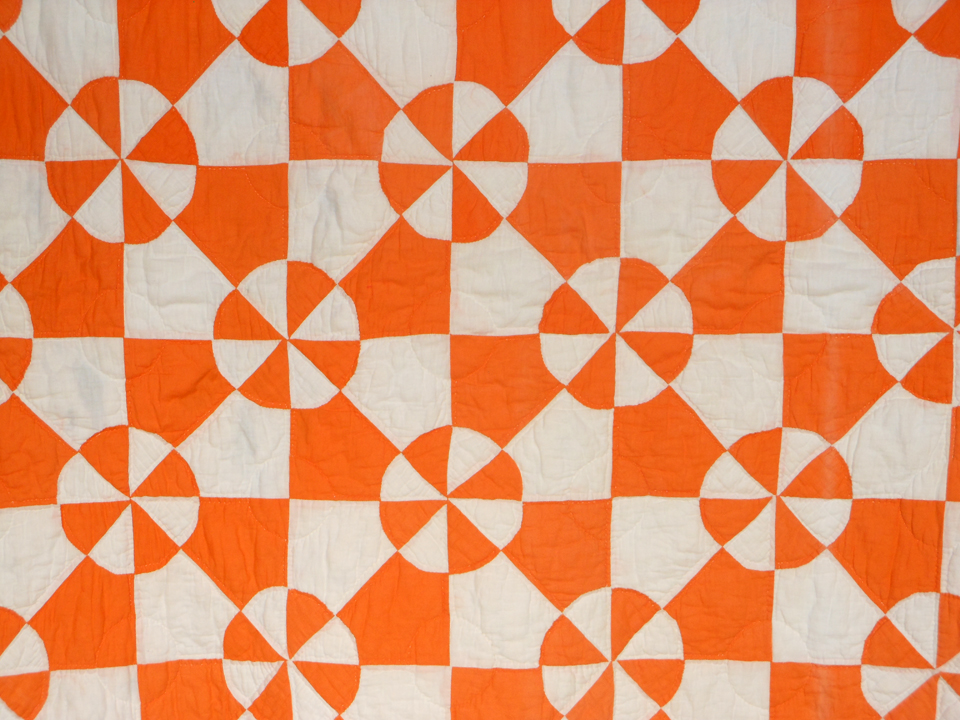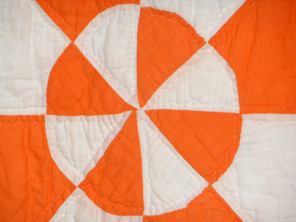Unusual pumpkin orange quilt. Hand and machine pieced, hand quilted. 6-1/2 inch blocks. The binding is turned over from back to front and machine stitched. The maker's name is available upon sale. There is some fading on one corner. Professionally hand washed by Betsey. Always sent on approval.