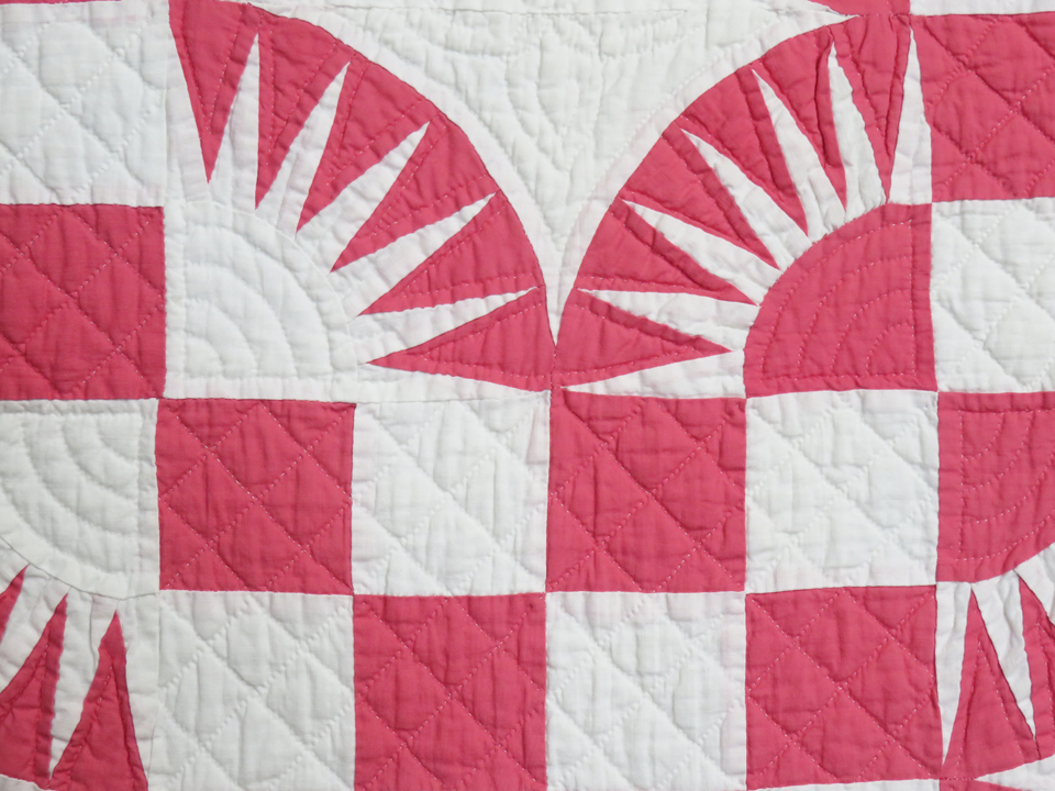 Three blocks of different designs are combined to create what I believe is an original quilt pattern. One block is a quarter of the Blazing Star pattern block. One block is a 12 block formation, while the third block is placed around the outside of the pieced pattern. This is a rectangular block that is a combination of the other two blocks. The wide border is edged with a delicate scallop and finished with a 1/4 inch hand binding. The quilting design and the quilting are small and perfectly executed. This is an amazingly beautiful quilt that had never been used or washed. The delicious strawberry color is a focal point of today's color schemes. Now professionally hand washed by Betsey and ready for its new home, it will fit any size bed. Must be seen to fully grasp the beauty and graphics of this quilt.