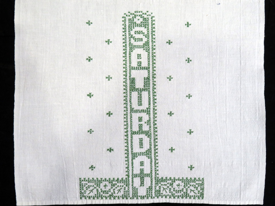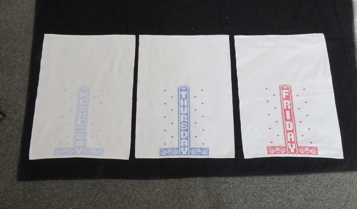 A complete hand cross-stitched set of 7 dish towels. A different color for each day of the week. Created on heavy white feed sack fabric. The width measures selvage to selvage (finished side to side). These appear to be barely used. They are professionally washed and ironed. There are still a few very muted original stains. Sold as a set of 7.