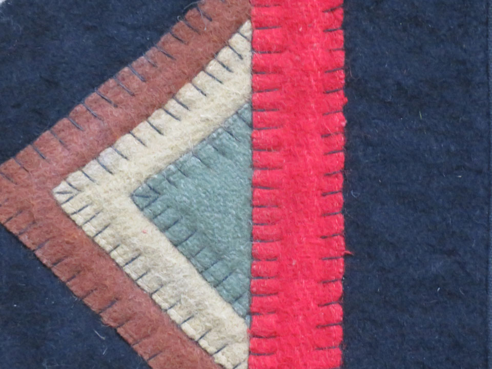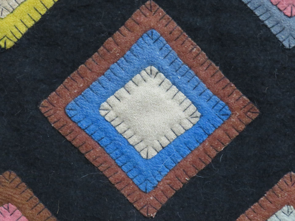 Believe it or not, this abstract folk art textile was created as a rug. Luckily, it has never been used. The rug is designed in two stacking methods. The first stacking is done in three squares measuring 4 1/4 inches, 3 1/4 inches and 2 inches. Each piece is outlined in a black buttonhole stitch. The second stacking combination is 3/1/4 inches with a 2 inch piece stacked on top and then outlined in a black buttonhole stitch. All fabric is 100% wool. There are two outside borders. One is a black 1 7/8 in border followed by a red 1 1/4 border. Someone in its history has already put sleeves on to get it ready for hanging. This gorgeous folk art geometric piece is outstanding as art for your wall. When hung, the piece looks 3-dimensional, and yes, you could put it on the floor as a rug, but I would want it on the wall. This quilt already has sleeves sewn on the back in case you would like to hang it as art on a wall.