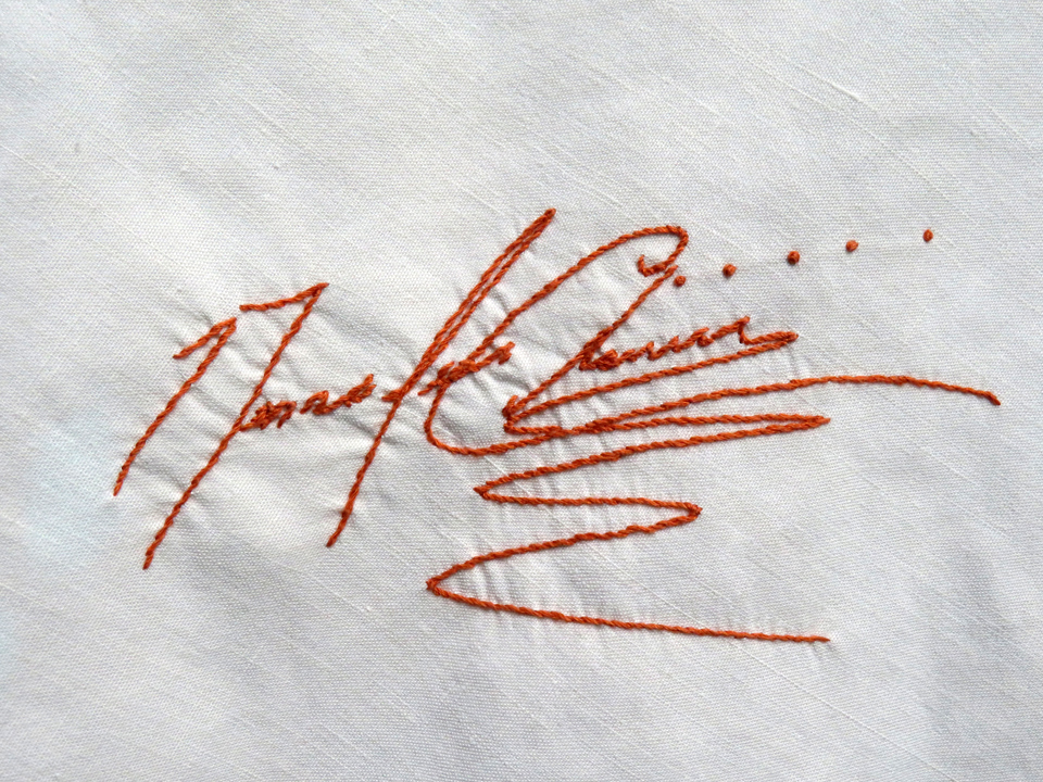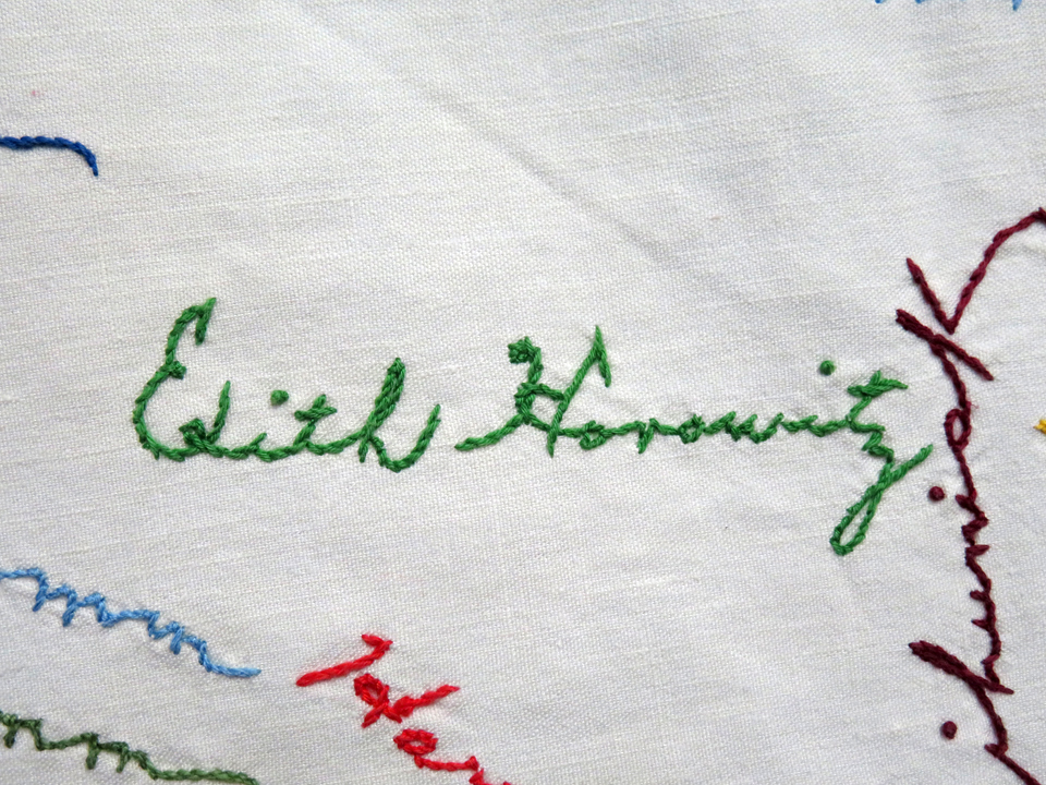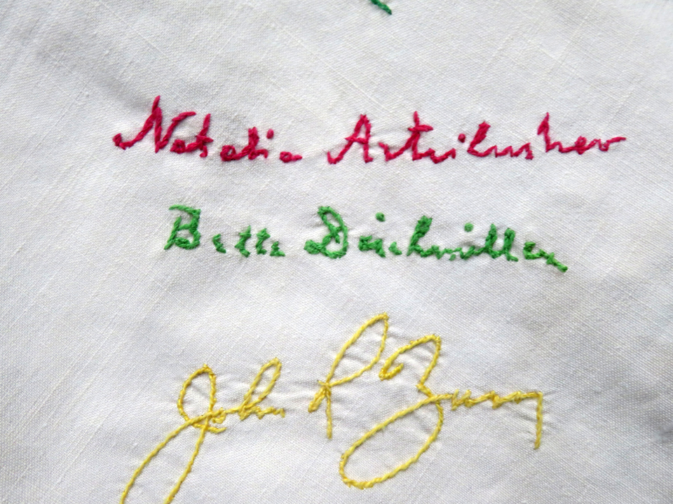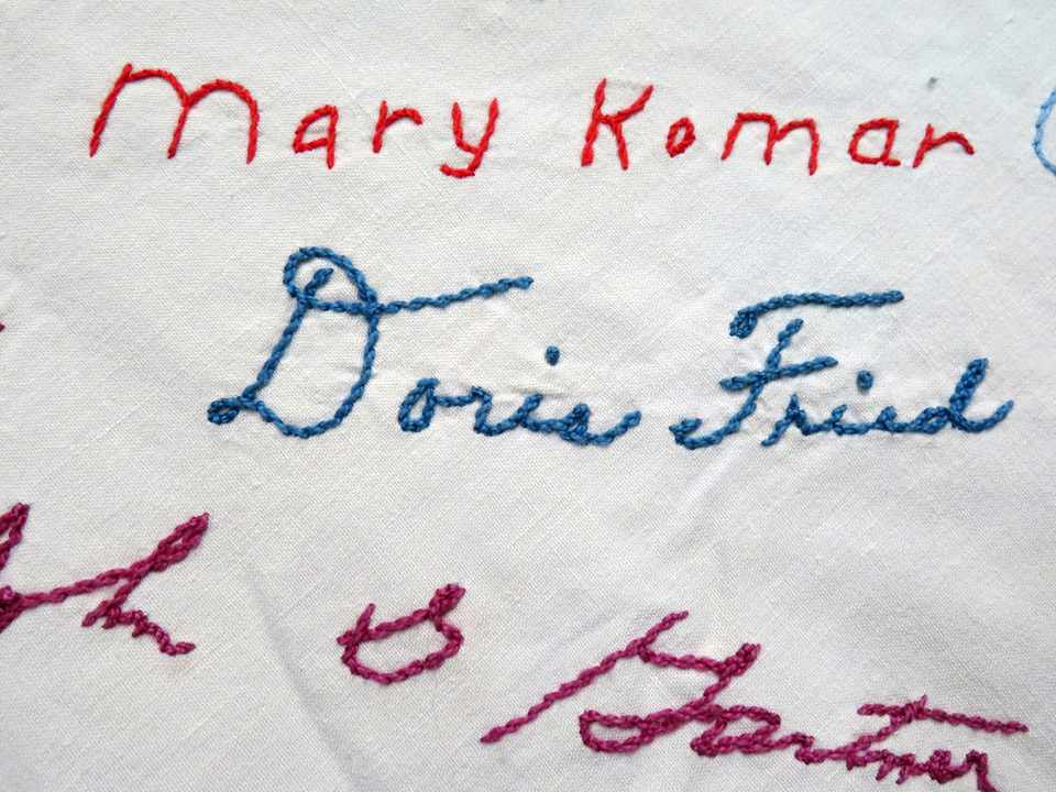 A 15 year anniversary present with dozens of hand embroidered signatures. One of a kind. Funky folk art.