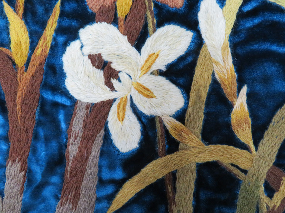 Irises of white and gold on a Prussian blue silk velvet. Was this originally made as a center medallion for a crazy quilt or was it made on it’s own merit? The embroidery is so lush it’s actually three dimensional. This piece is absolutely gorgeous. This would look perfect hung on the wall. We can sew sleeves to the back for borderless framing.